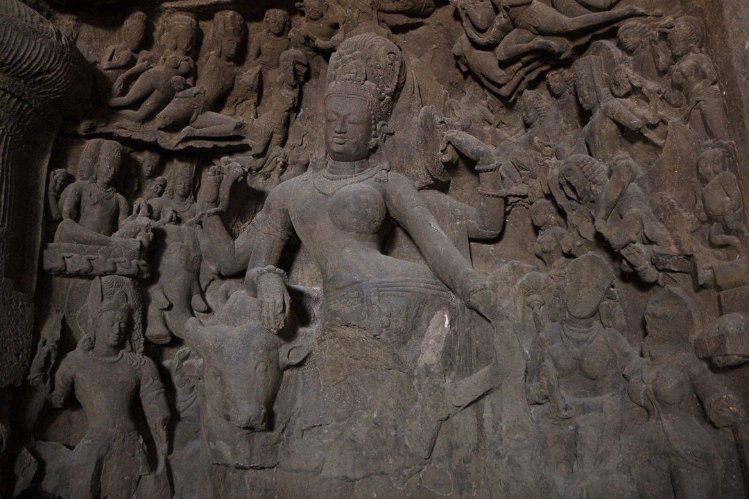 Ardhanarishvara, halb Shiva halb Parvati in einer Person, leigend auf dem Reittier Shivas, dem Stier Nandi