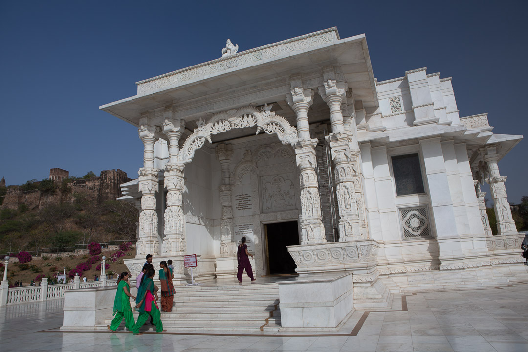 Tanz Schwerttanz Jaipur Birla Lakshmi-Narayan-Mandir, im Hintergrund das Moti Dungri Fort, das ein wichtiges Shiva-Heiligtum enthält