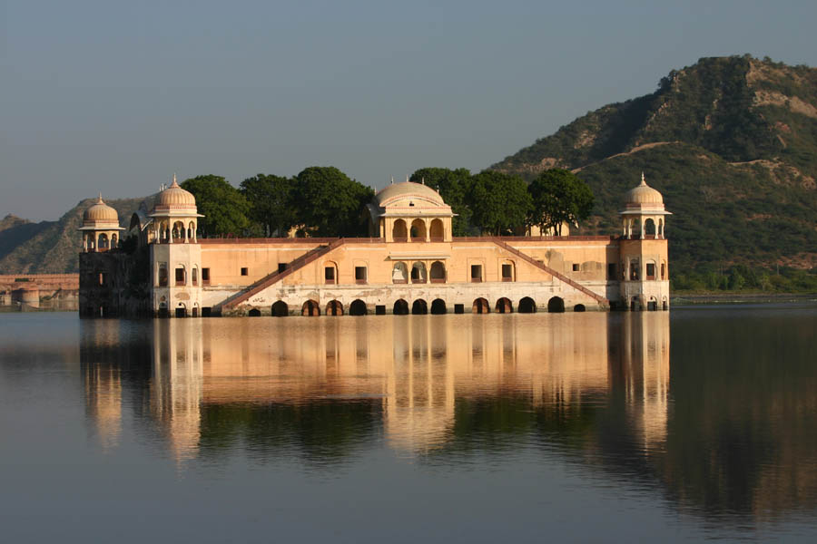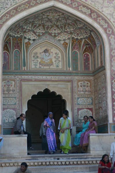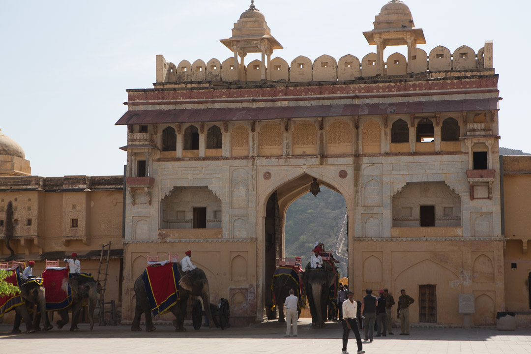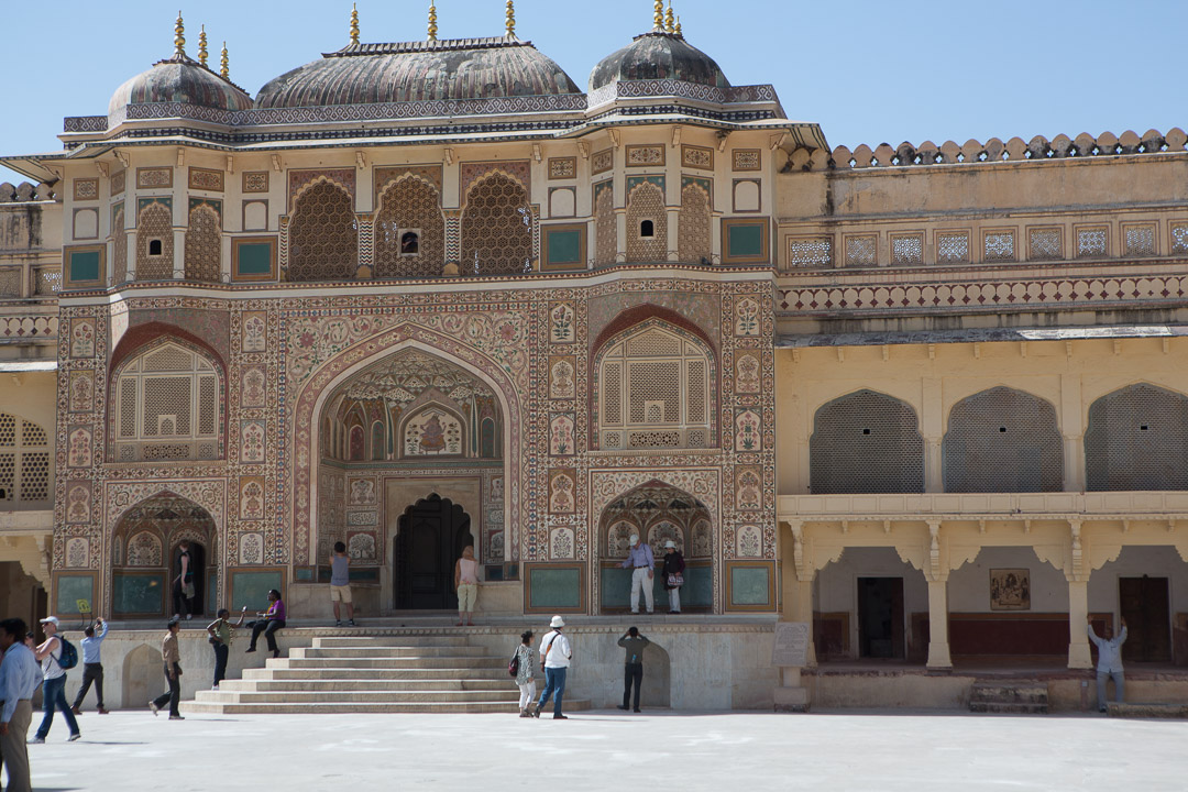 Jaipur - Amber-Fort Klassischerweise erklimmt man die Höhe auf dem Rücken eines Elefanten, deren Arbeits- und Lebensbedingungen genauso wie die ihrer Mahouts sehr fragwürdig sind. Tips für die Mahouts sind verboten, aber im Lohn einkalkuliertJaipur - Amber-Fort Jaipur - Amber-Fort Ganesh Pol, der Zugang zum ehemals privaten Bereich des Fort Jaipur Palast Jal Mahal auf halber Strecke zwischen Jaipur und Amber