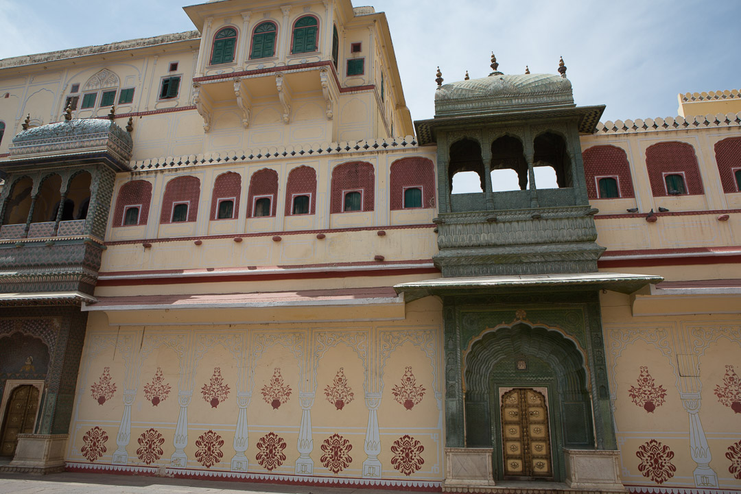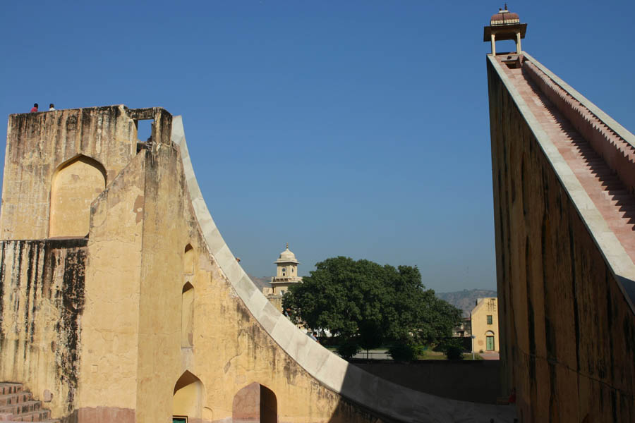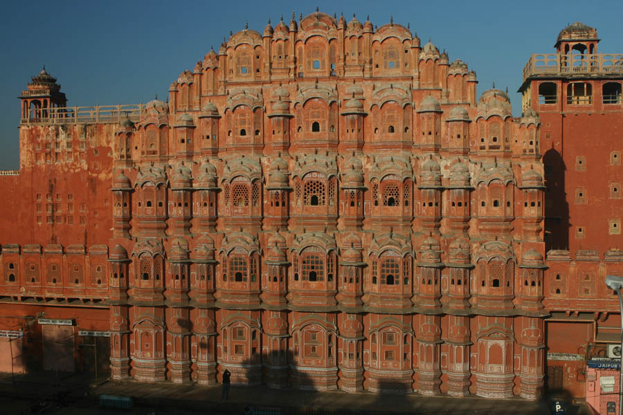 Jaipur Palast der Winde (Hawa Mahal), erbaut 1799, um den Damen des königlichen Haushalts zu ermöglichen, die Vorgänge auf der Strasse, zB Processionen, zu beobachten ohne gesehen zu werden Jaipur - Jantar Mantar Observatorium mit einer Ansammlung von riesigen Sonnenuhren und astrologisch-astronomischen Messinstrumenten, erbaut 1728 von Maharaja Jai Singh. UNESCO WeltkulturerbeJaipur Stadt-Palast des Maharaja