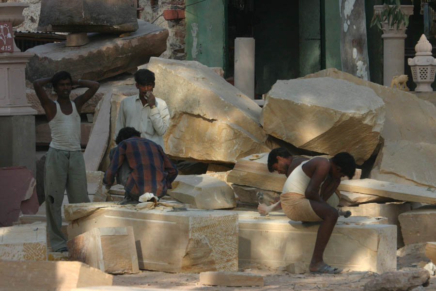 Die Marmor- und Stein-Industrie ist sehr bedeutsam in Rajasthan und trotz der harten Arbeitsbedingunrgen mit viel Kinderarbeit verbunden (deswegen die niedrigen Preise für indischen Marmor bei uns)Steinmetze