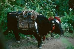 Statt Yaks werden in dieser Region meist Dzo als Tragtiere benutzt, sie sind eine Kreuzung aus Yak und normalem Rind, zottelig und stur wie Yaks
