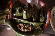 Lebensmittel werden hier verkauft, auch fertig zubereitete Speisen. Sehr gut: Frisch geernteter Klebereis, gekocht mit Zucker und Kokos, abgepackt im Bananenblatt.. Es gibt