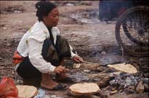 Frösche, lebend und an den Beinen zusammengebunden, viel Gemüse, junger Bambus und Rattanspitzen, gekochte Seidenraupen, Schnecken. Vor der Halle werden Reismehlfladen am offenen Feuer gebacken. Auch einige Akha aus den Bergen der Umgebung kaufen und verkaufen hier. In einer Suppenküche an der Hauptstasse nehmen wir unser Frühstück,