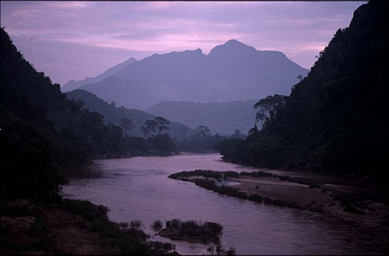In Muang Khoa machen wir bereits am frühen Nachmittag Quartier im Guesthouse „Nam Ou“, das schön über dem Fluss liegt und heisse Duschen hat. Der Ort selbst macht einen eher tristen Eindruck. Über den hier in den Nam Ou einmündenden Nebenfluss führt eine von den Vientamesen erbaute Hängebrücke zum Militärcamp auf der anderen Seite, die Brücke wird als gute Gelenheit zur Entsorgung von Müll genutzt, der von hier in den Fluss geworfen wird. Über den Nam Ou findet der Transport mit kleinen Booten statt, die Fracht wird dieseits von den LKW abgeladen, auf die Boote verladen und auf der anderen Flussseite wieder auf LKW verladen zum Weitertransport in Richtung Vietnam. Eine grössere Fähre, die die LKW befördern könnte, ist zwar vorhanden, scheint jedoch ausser Betrieb.