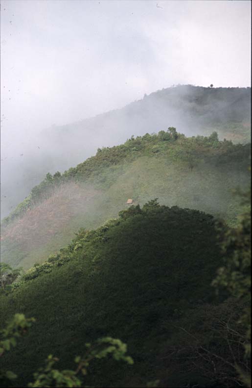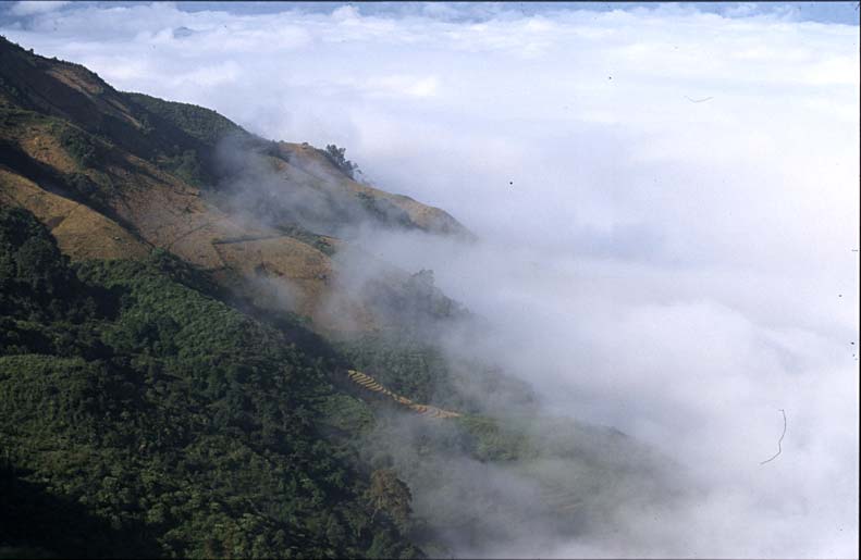 Vom Hotel aus unternehmen wir am nächsten Vormittag eine Wanderung durch zwei Dörfer, das erste wird von 30, das zweite von 60 Familien bewohnt. Der Weg ist so, dass uns gegen Mittag unser Truck abholen kann und wir nicht den ganzen Weg zurückgehen müssen. Das Tal unter uns ist vom Nebel eingehüllt, aus dem einzelne Berge wie Inseln herausragen, ein typisches Bild für diese Gegend. In den Dörfern wohnen Phu Noy, überall sieht man Steinmauern ohne Mörtel.