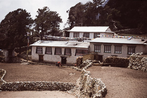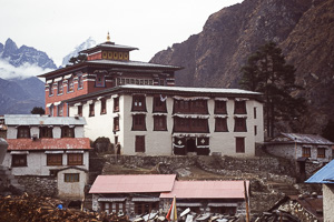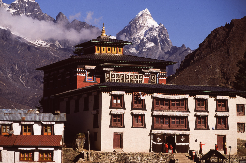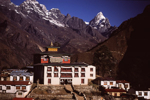 klein im Tal zu sehen das Kloster Tengpoche