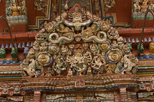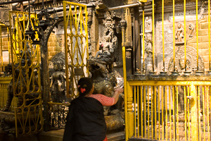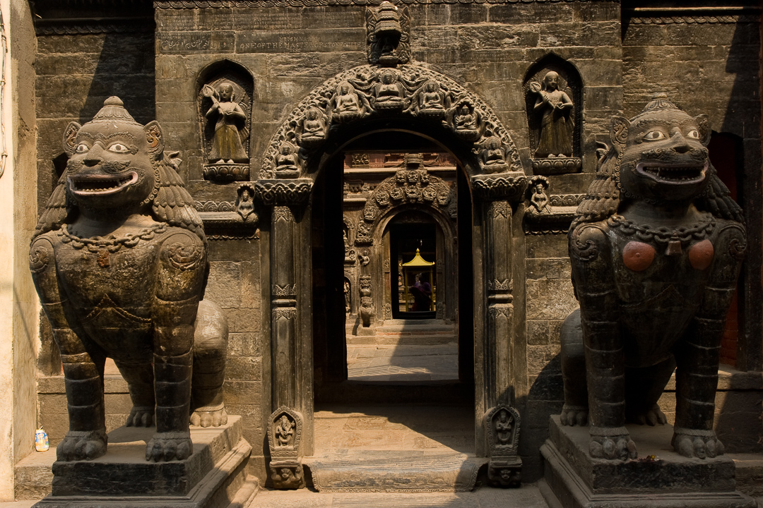 Löwe am Eingang des Mul Chok, im Hintergrund Krishna-Tempel und Vishveshvara-Tempel