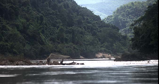 In Muang Khoa machen wir bereits am frühen Nachmittag Quartier im Guesthouse „Nam Ou“, das schön über dem Fluss liegt und heisse Duschen hat. Der Ort selbst macht einen eher tristen Eindruck. Über den hier in den Nam Ou einmündenden Nebenfluss führt eine von den Vientamesen erbaute Hängebrücke zum Militärcamp auf der anderen Seite, die Brücke wird als gute Gelenheit zur Entsorgung von Müll genutzt, der von hier in den Fluss geworfen wird. Über den Nam Ou findet der Transport mit kleinen Booten statt, die Fracht wird dieseits von den LKW abgeladen, auf die Boote verladen und auf der anderen Flussseite wieder auf LKW verladen zum Weitertransport in Richtung Vietnam. Eine grössere Fähre, die die LKW befördern könnte, ist zwar vorhanden, scheint jedoch ausser Betrieb.